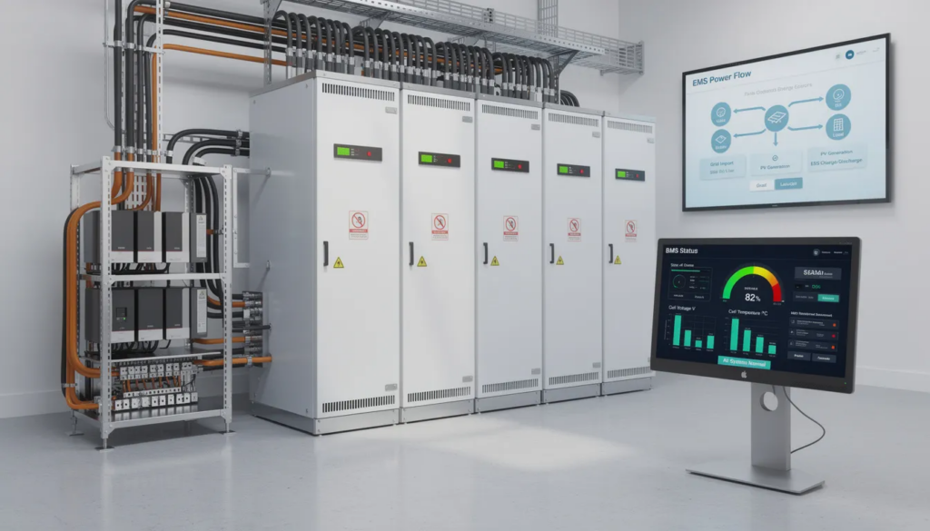 The power conversion system (PCS) converts the direct current (DC) stored in the batteries into alternating current (AC) suitable for use in a home or business. The energy management system (EMS) coordinates overall operation, optimizing when and how energy is stored or discharged based on consumption patterns, electricity prices, and grid conditions.